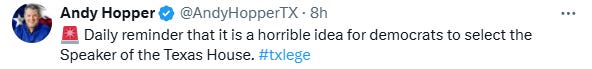The Texas House has 150 members. Eighty-eight are Republicans, and 62 are Democrats. To win the vote as Speaker, one must get 76 votes. Democrats do not have the numbers to win, and as polarized as things are, there is no way 14 Republicans would cross the aisle to vote on Speaker.