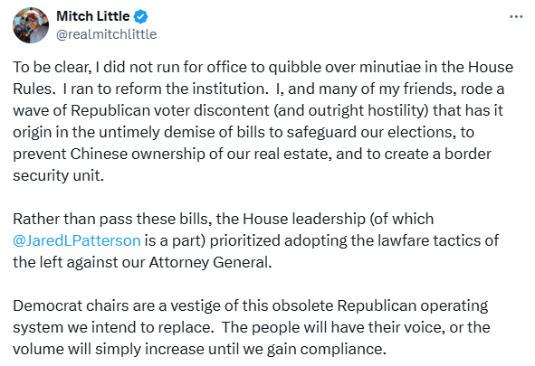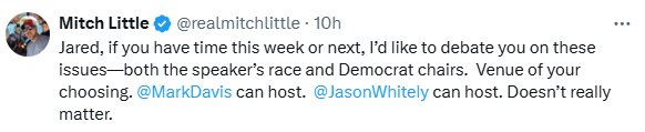 Newly elected Mitch Little (R-HD65) challenged Patterson to a debate.