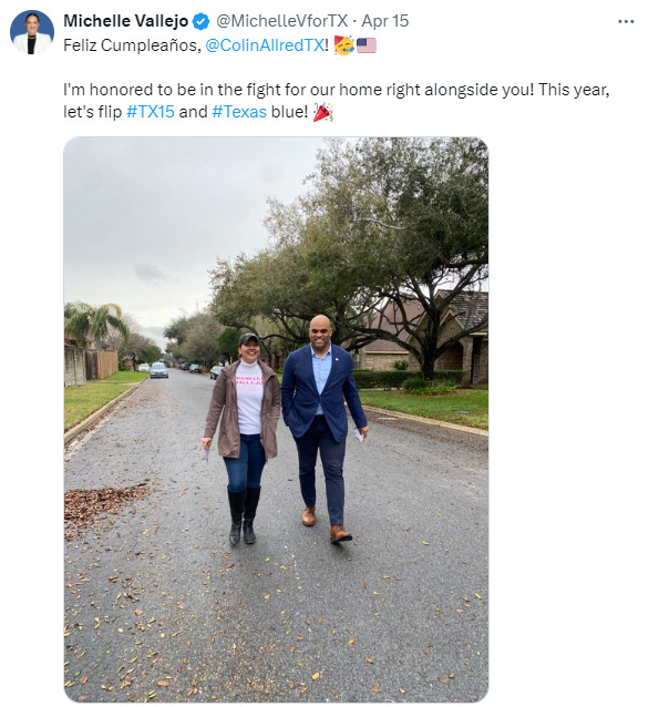 Last month, US Senate Candidate Colin Allred was seen down in TX15, blockwalking with Michelle Vallejo.