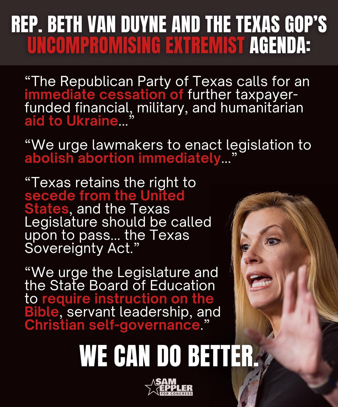 Second, directly engage voters on the issues that matter most to them. With TX24’s high concentration of educated voters, economic stability and policy-driven conversations will be essential. This means continuing to hammer home Beth Van Duyne’s positions and how her positions are not only extreme but actively harmful to the district’s future. Eppler should make it clear that Van Duyne’s far-right agenda will only push the district backward.