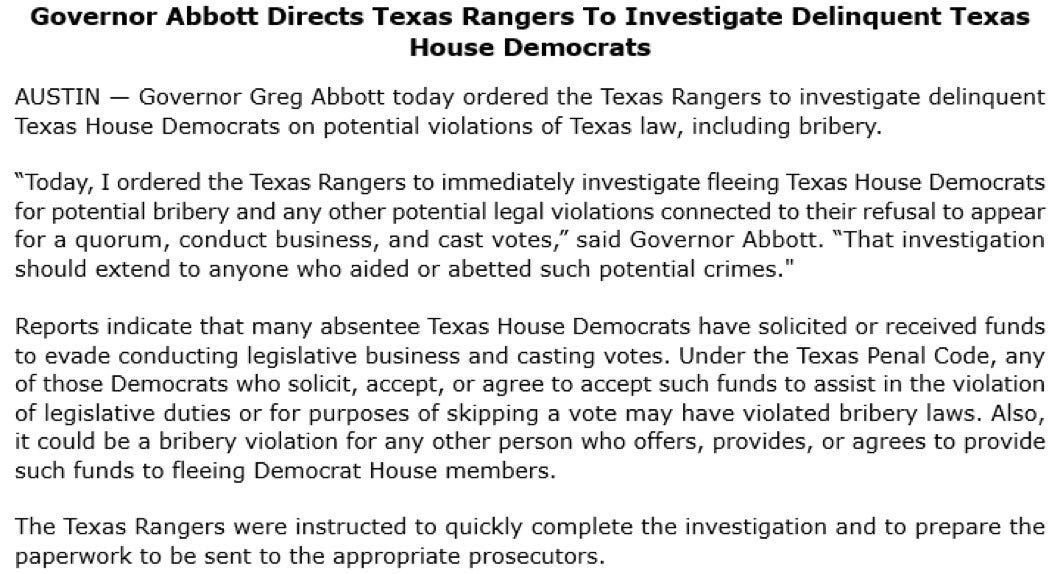 Not only has Greg Abbott issued arrest civil warrants for the missing Democrats (not enforceable outside of Texas), but he’s also directed the Texas Rangers to criminally investigate Democratic lawmakers for exercising a peaceful, legal political tactic of breaking quorum to stop a fascist redistricting plan. He’s threatening them with felony bribery charges simply for accepting donations while standing up to an illegitimate power grab.