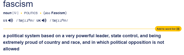 According to the Cambridge Dictionary, the definition of fascism is a political system based on a very powerful leader, state control, and being extremely proud of the country and race, in which political opposition is not allowed.