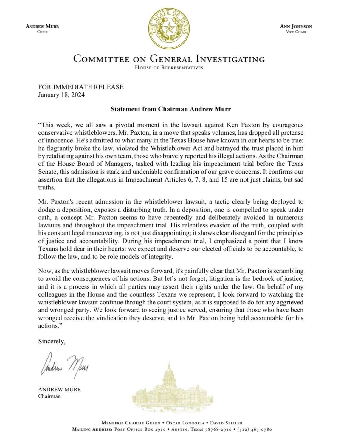 In a scathing statement, Representative Andrew Murr (R), who led the investigation and impeachment, says Paxton has “admitted to what many in the Texas House have known in our hearts to be true: he flagrantly broke the law” and is trying to “dodge” having to testify under oath.