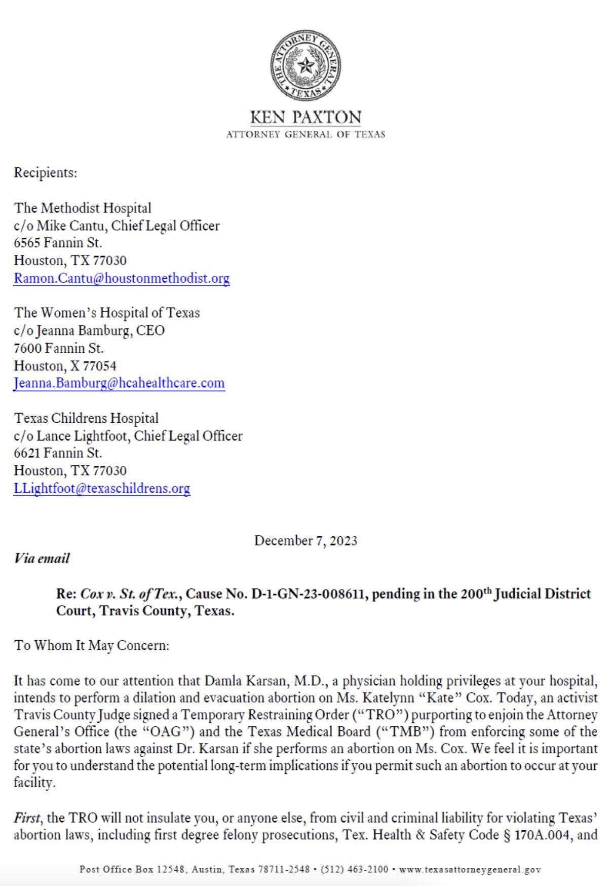 Yesterday, Ken Paxton filed an appeal and threatened “hospitals, doctors, or anyone else” with first-degree felony prosecutions if they provide an abortion to Cox.
