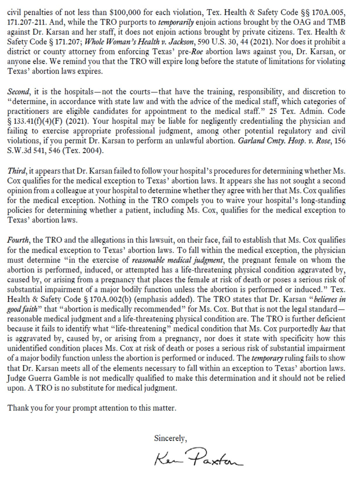 Paxton argued against the restraining order, stating it didn’t meet the criteria for a medical exemption under Texas’ abortion laws. Read his outrageous letter here: