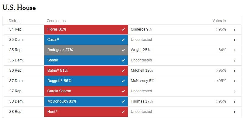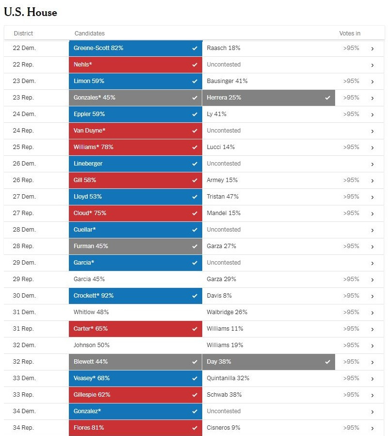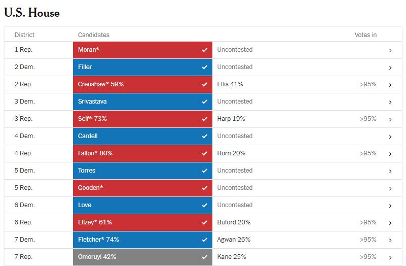 Incumbents Dan Crenshaw (R-TX02), Keith Self (R-TX03), Pat Fallon (R-TX04), Jake Ellzey (R-TX06), Michael McCaul (R-TX10), Monica De La Cruz (R-TX15), Pete Sessions (R-TX17), Jodey Arrington (R-TX19), Roger Williams (R-TX25), Michael Cloud (R-TX27), John Carter (R-TX31), and Brian Babin (R-TX36) all won their primary elections.