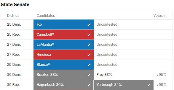 Also, SD30 had several Democrats and several Republicans. Both sides are going to a runoff. So, here’s what we’re looking at in the Texas Senate: