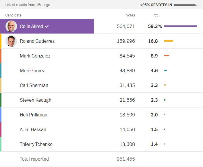 While Roland Gutierrez did pull into second place, behind Allred, it wasn’t enough to force a runoff. On the bright side, Gutierrez still has his seat in the State Senate, and we can still expect him to give Dan Patrick hell in the next legislative session. Gutierrez is a good man and was a good candidate, but it’s hard to beat someone who has outraised you 20-1.