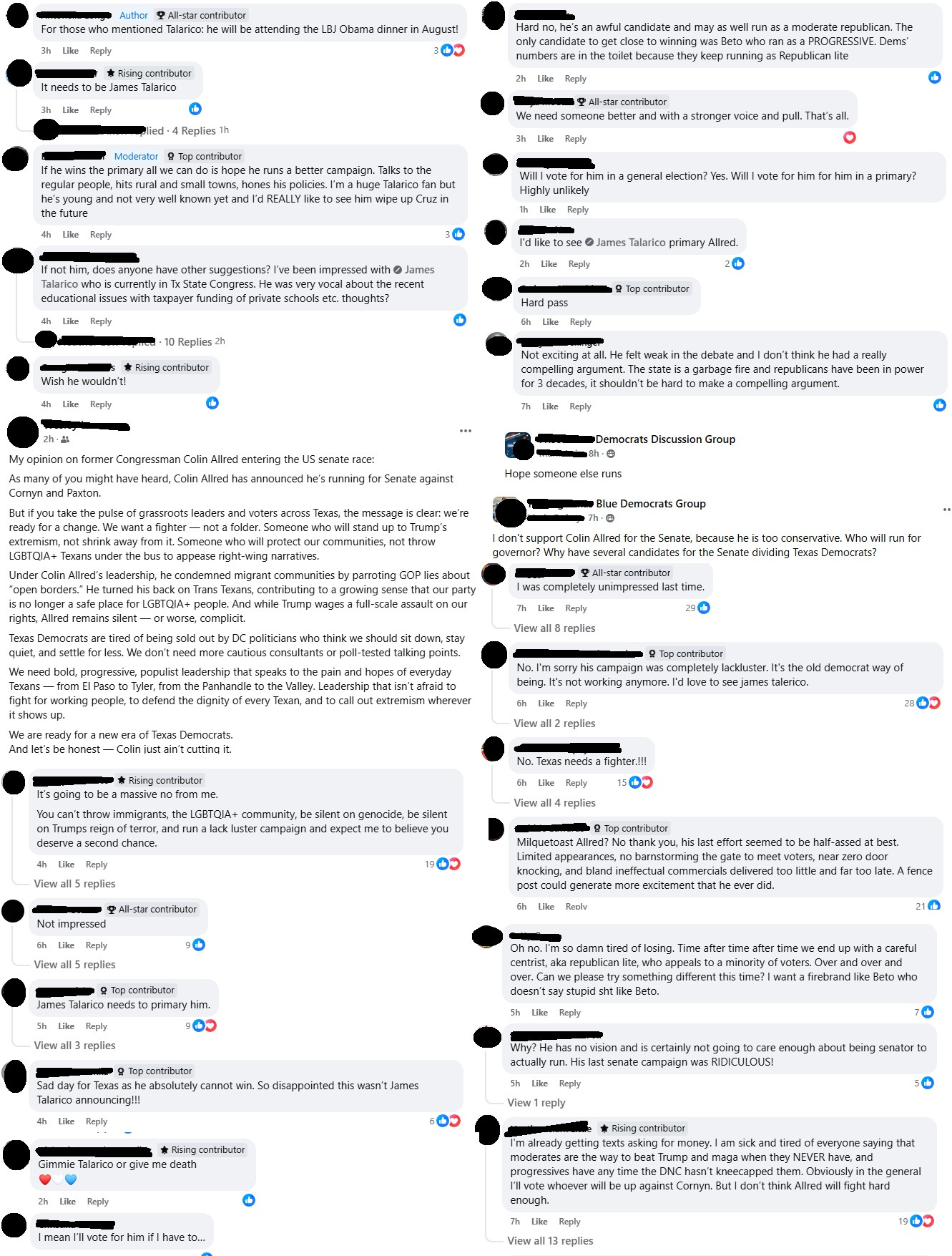 Regardless, I intentionally put myself in social media spaces where Texas Democrats tend to congregate, and Allred’s campaign announcement has not generated excitement (and the screenshots above are just a small sample).