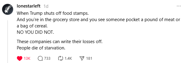 Yesterday, Texas warned that 3.5 million people would lose SNAP benefits in November if the government shutdown continued, which prompted the following Threads post.