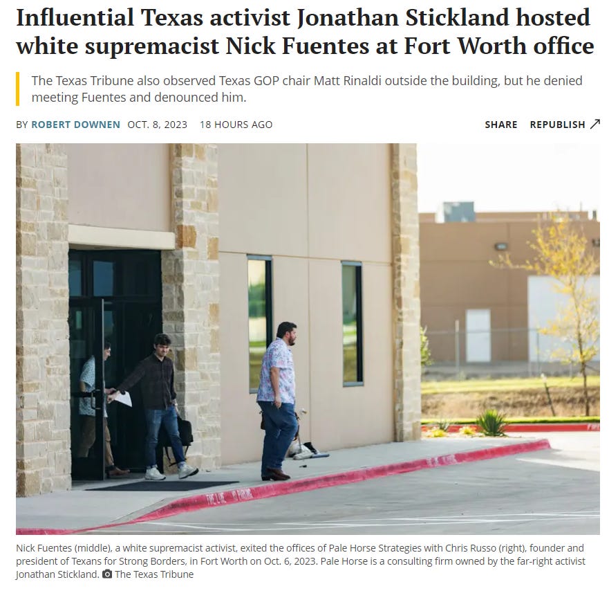 The last 24-hours in Texas politics have been completely off the rails. If you missed it, yesterday Robert Downen with the Texas Tribune broke a story, with photographic evidence, about how well-known white supremacist and self-proclaimed neo-Nazi Nick Fuentes was meeting with Republican operatives and activists at the Pale Horse Strategies office.