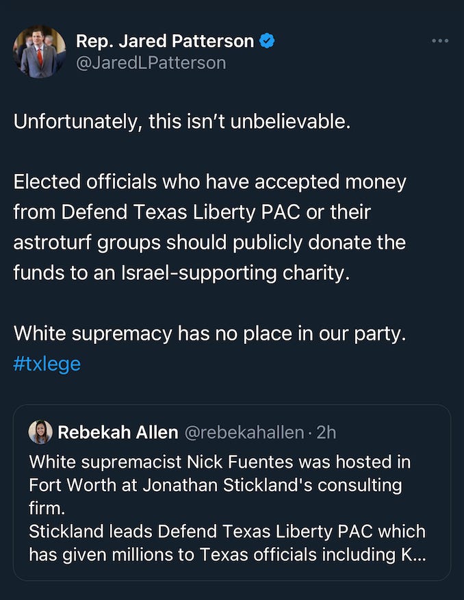 But in terms of the GOP Civil War, several members of the not-neo-Nazis side have spoken up. Representative Jared Patterson calls for officials to donate funds from Defend Texas Liberty - the leader of which we just reported met with white supremacist Nick Fuentes - to pro-Israel charities.