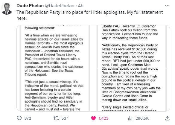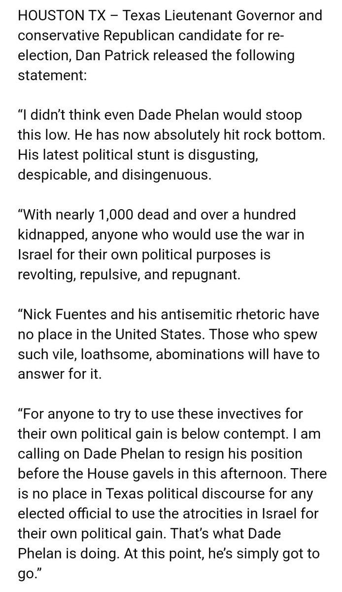 Phelan called on every recipient of money from the Defend Texas Liberty Pac to return the money, including Dan Patrick and his $3 million bribe he took to acquit Ken Paxton. Phelan even offered to loan Rinaldi the money he got from the Defend Texas Liberty PAC until he made it up in other donations.