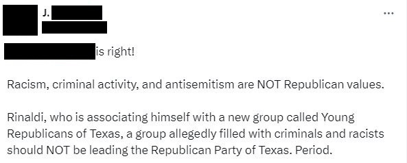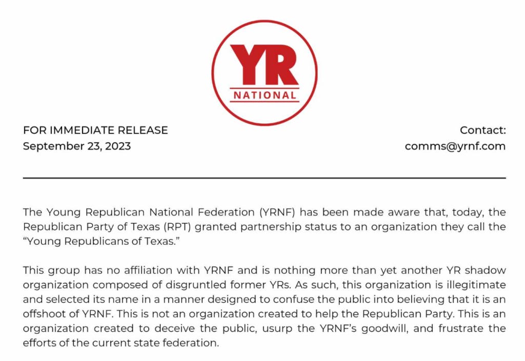 After that, Rinaldi thrust Texas State Republican Executive Committee auxiliary recognition process a totally new group, “Young Republicans of Texas.” The group, which was formed less than a month before gaining official recognition from the party, represents an obvious attempt to confuse voters and to misrepresent itself as the established Texas Young Republican Federation.