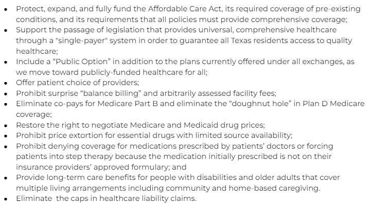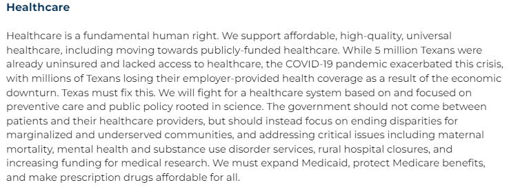Universal healthcare is not just a progressive ideal. This plank reflects the will and needs of Texans across the state. Including universal healthcare in the TDP platform shows that the TDP is strongly aligned with the people's values and priorities. (It’s kind of a big deal.)