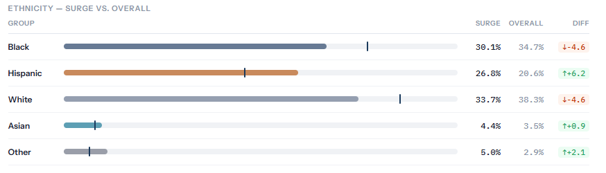 This showed that while Hispanic and Asian voter turnout was up, both Black and white voter turnout was down. It would be interesting to see a simialar dataset for Dallas County. I haven’t seen any data companies that have one (if you know of any, email me). But this could spell trouble for the Crockett campaign.