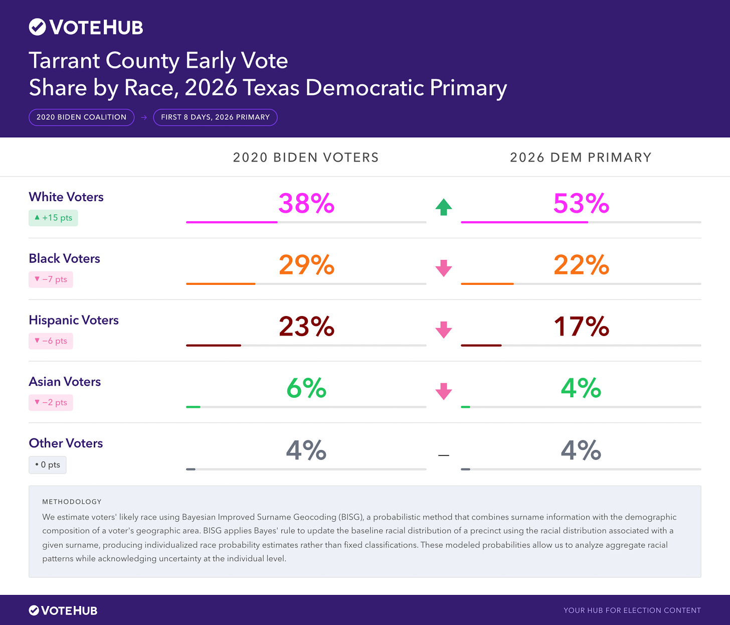 If you missed it today, VoteHub published a deep dive on Tarrant County’s data. Remember that’s the bellwether county every political analyst in the country is watching. And the numbers are interesting.