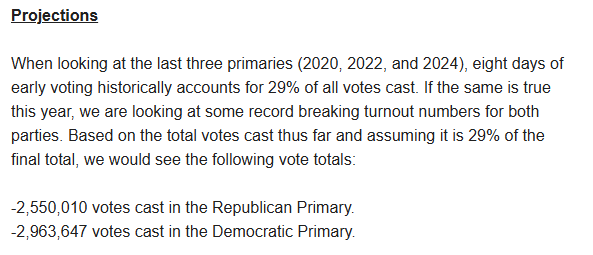 Higher female turnout is a good sign for Jasmine Crockett, but aside from that, look how different it is for each party. Democrats are overwhelmingly female, while Republicans are slightly more male.