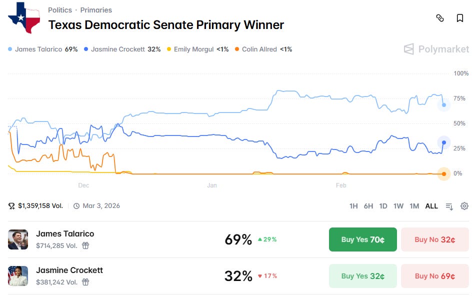 One more word about the Senate primary. At this moment, Polymarket is showing Talarico at 69% and Crockett at 32%.