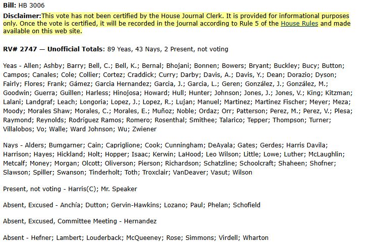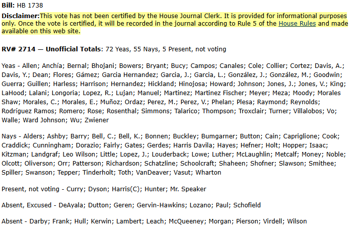 I’m not sure exactly what happened, but it appears that Terry Canales (R-HD40) wanted to call a POO (point of order), and somehow Ellen Troxclair (R-HD19) blocked him… stopped him… I don’t know how, but Canales was pissed, even calling Troxclair, “un-statesman.” Canales successfully killed the bill.