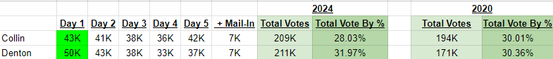 Collin and Denton County continue to see an increased turnout based on raw voters, but the total registered voters in Collin County haven’t entirely caught up yet.