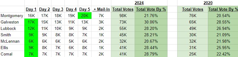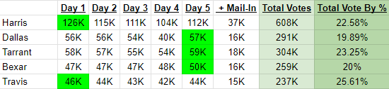 Harris and Travis’ highest turnout day was still Monday. Harris County Democrats were most likely in line for yesterday’s Kamala Harris rally, and Houston’s traffic was garbage. Yesterday was their third biggest day in Harris County.