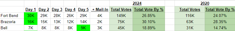 I’m also monitoring Fort Bend, Brazoria, and Bell Counties. All three are seeing higher turnout than in 2020.