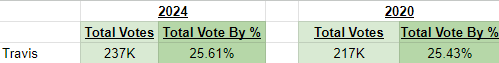 We haven’t discussed Travis County much. Blue faithful, Travis County is blue and getting bluer. Its Day 5 numbers in 2024 exceed those from 2020 in both raw numbers and percentage of registered voters. Travis County is doing great.