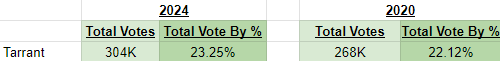 We’re also seeing something interesting from Tarrant County. While Tarrant is Texas’s third-most populous county, it’s seeing the second-highest turnout behind Harris County.
