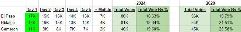 In the next update, I’ll work on the numbers for the other border counties to give you a better picture. A high voter turnout in our biggest, bluest counties is most important in flipping the state. That will go a long way to flipping Texas and canceling out the Republican votes in rural Texas.