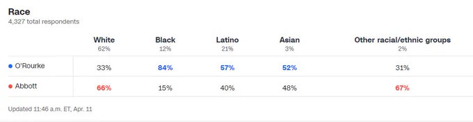 Furthermore, Beto won the Black, Latino, and Asian votes. In a state where Anglos are a minority, but since it was mostly only white people that voted, Abbott won.