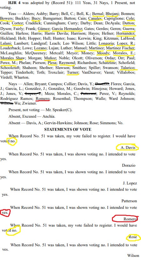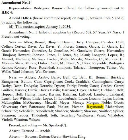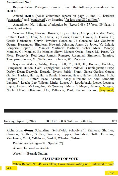 Every Democrat voted in favor of the amendment except Richard Raymond (D-HD42). Toni Rose (D-HD110) accidentally pressed the wrong button (it’s not a big deal; it happens) but corrected it in the journal.