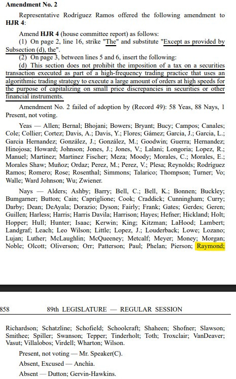 Next, Ramos introduced her second amendment, which specified that algorithmic trading that executes huge numbers of orders at very high speeds for hedge funds could still be taxed.