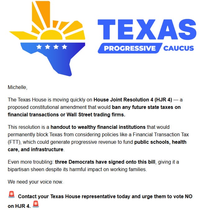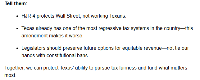 Today, on April Fool’s Day, the Texas House finally started debating bills on the House floor. The very first bill they offered was a constitutional amendment to give Wall Street a tax-free pass forever. HJR4 shields wealthy financial institutions and Wall Street-type actors from taxation and enshrines protections for financial elites in our state constitution. Basically, it codifies plutocracy.