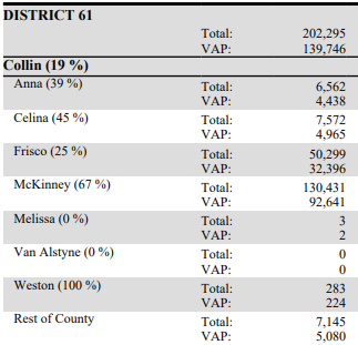 House District 61 is in Collin County and includes Anna, Celina, Frisco, McKinney, Melissa, Weston, and some county areas.