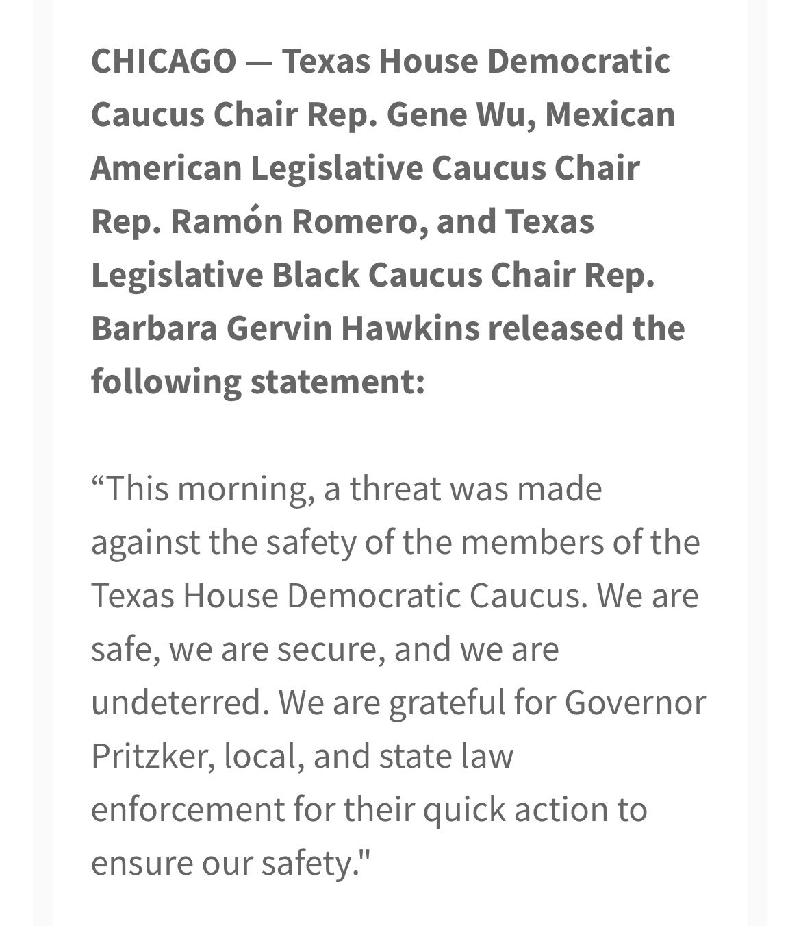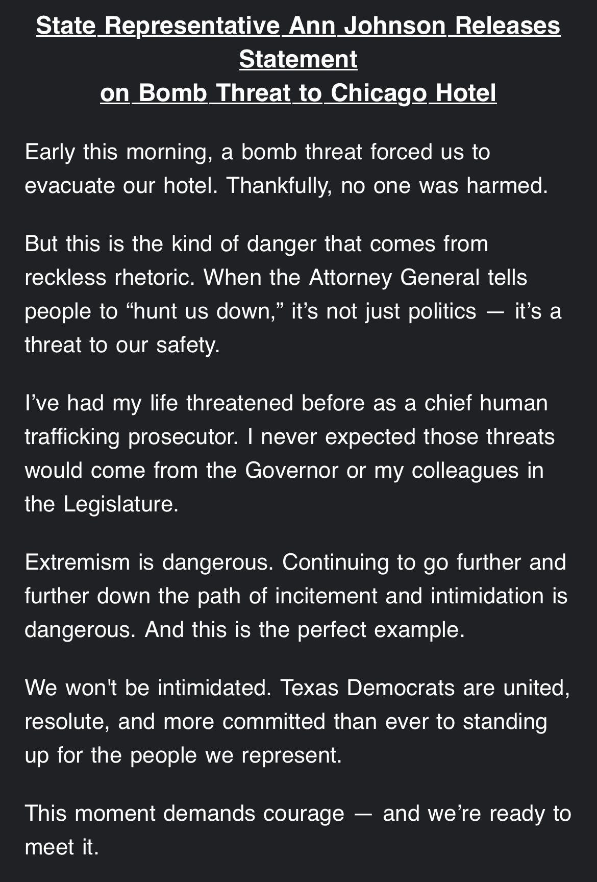 Yesterday, the far-right propaganda outlet, Next News Network, published the location where Texas Democrats were staying in Chicago. This morning, they were woken up to being evacuated due to bomb threats in their hotel.