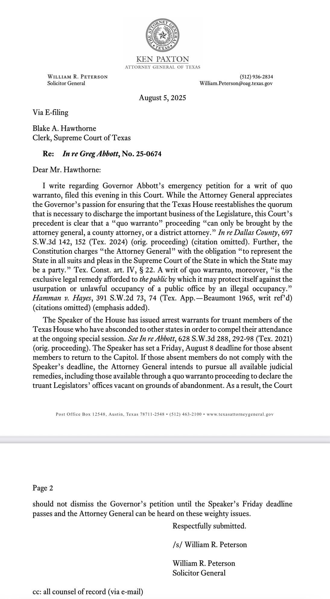 The Attorney General sent a letter stating that Abbott must recede because only the AG, a DA, or a County Attorney has the legal authority to file the lawsuit the Governor filed. So basically, Ken Paxton agrees that the Governor’s filing was astonishingly stupid.