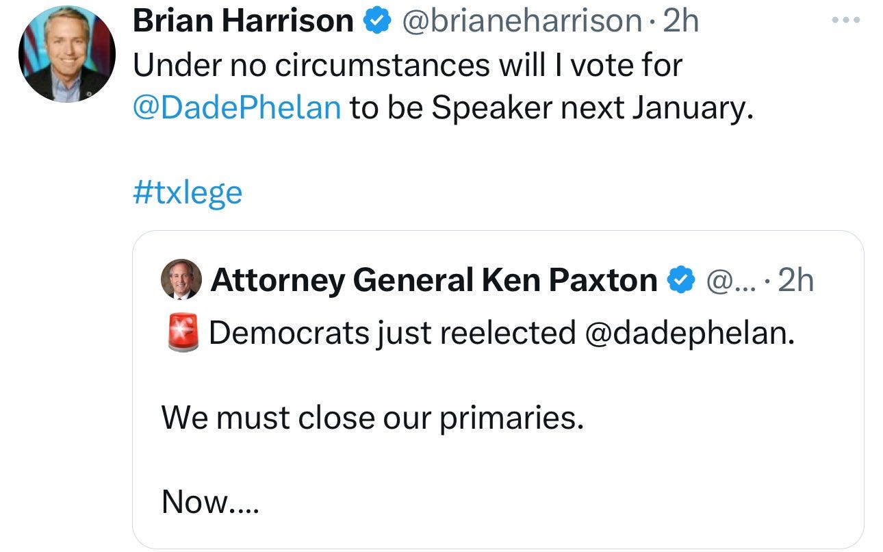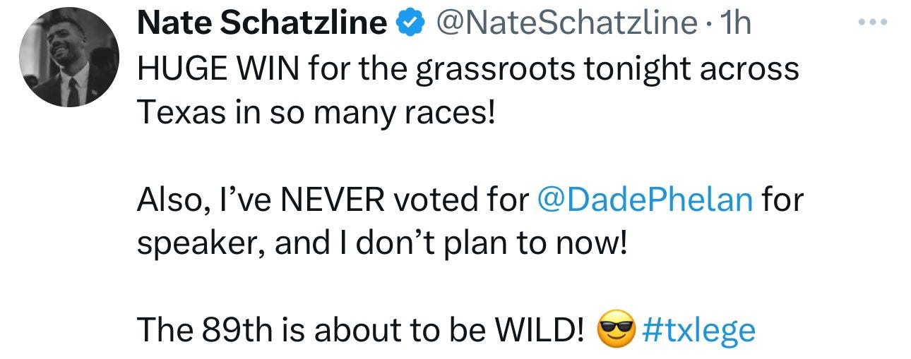 Speaker Dade Phelan actually did it. He pulled off a win against a candidate who was endorsed by Trump, Paxton, and Patrick. This speaks largely on the fractures within the Republican Party and the appearance that there is at least one place in Texas where Trumpism is losing. Phelan is a crucial piece in the GOP Civil War and several far-right Paxton loyalists are already swearing against his speakership next year.