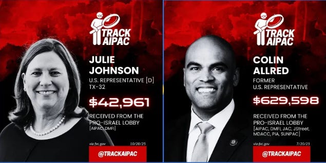 Note: A group of friends was discussing how Julie Johnson has made millions in the stock market since being in Congress, and a $42,000 donation from AIPAC isn’t that big of a deal. My response to that is, if it’s just pennies, why still take it, knowing how controversial it is?