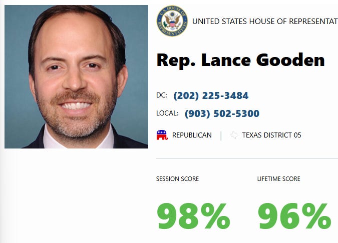 Also, Gooden has a lifetime score of 96% with Heritage Action. As in the Heritage Foundation. As in the people who want to turn America back to a country where only white, male property owners had rights.