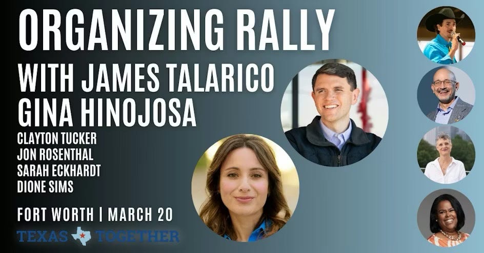 Last week, the “Texas Together” tour kicked off in DFW with Kendall Scudder, Gina Hinojosa, and Wendy Davis (?). This week, James Talarico is holding rallies with Clayton Tucker, Jon Rosenthal, and others.