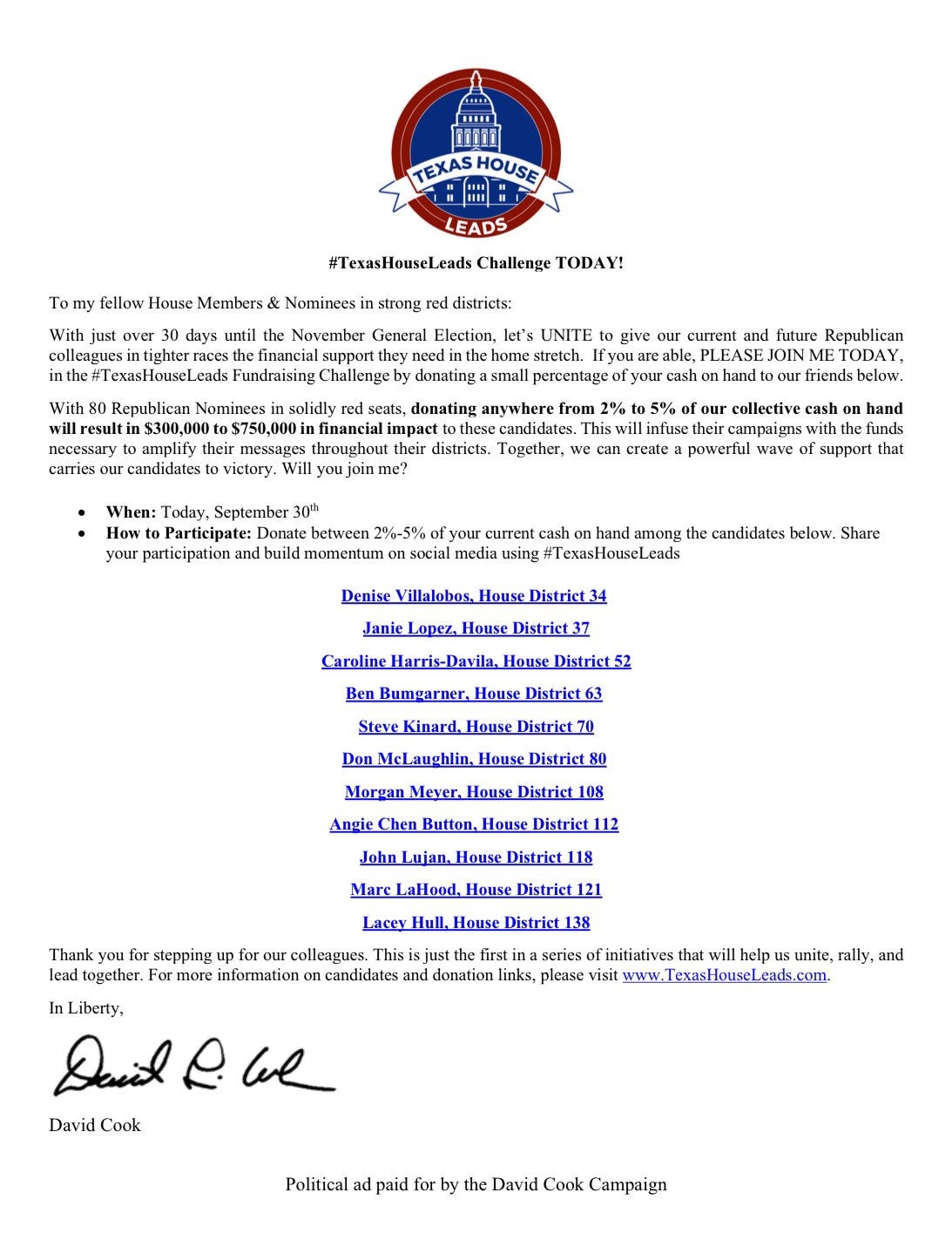 I’ll give you the links to all the Democrats running in Cook’s 11 seats. We have to help them win. Donate, volunteer, and get the word out. We only have 34 days left, and we can flip the Texas House… only if Democrats show up and vote.