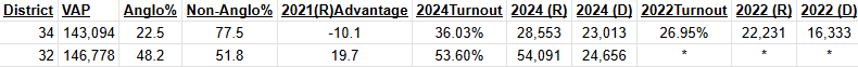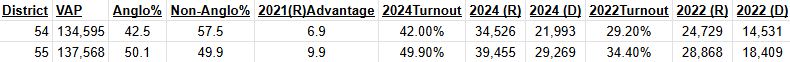 Meanwhile, over in HD63, the math looks a little less brutal, but still tricky. Republicans won in 2024 by about 9,500 votes (55.7% to 44.3%), up from a margin of about 7,600 votes in 2022. Turnout improved from 42% to 55% of the VAP, yet the gap widened. That means Democrats would need to net an additional 4,800–5,000 votes to flip the seat, which translates into shifting about 6% of the 2024 electorate. It’s plausible, especially in a year with a favorable environment.