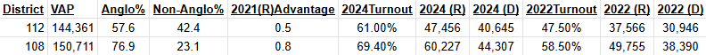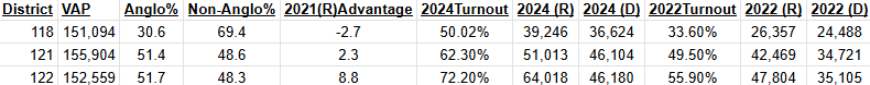 HD118 is already one of the most competitive seats in the state. In fact, Republicans only drew themselves a tiny 2.7% advantage here in 2021, and the numbers have backed that up. In 2022, turnout was only about 33.6% of the voting-age population, with Republicans edging out Democrats 26,357 to 24,488, a margin of less than 1,900 votes. By 2024, turnout rose to 50%, with Republicans securing 39,224 votes and Democrats securing 36,624 votes. That left Democrats trailing by only 2,622 votes, or about 1.7% of the electorate. To flip HD118 in 2026, Democrats would need to net just 1,312 votes, an entirely achievable target.