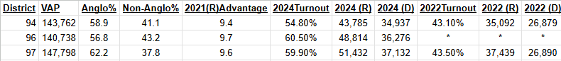 None of them are easy flips, but HD94 is the most promising, HD96 is possible with the right conditions, and HD97 would require a wave election, which we’re expecting next year.