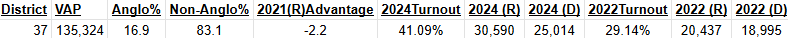 That margin of roughly 5,500 votes is not insurmountable. To flip HD37 in 2026, Democrats need to net about 2,800 additional votes, which is less than 3% of the total 2024 electorate.