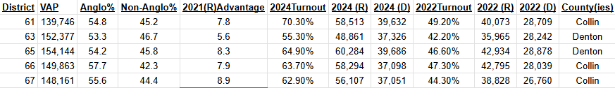 Take HD61, turnout in 2024 hit over 70% of the voting-age population, one of the highest anywhere in the state, yet Republicans still carried it 59.6% to 40.4%. That left Democrats trailing by nearly 19,000 votes. Back in 2022, with lower turnout, the gap was about 11,000 votes. For Democrats to flip this district in 2026, they would need to overcome roughly 9,500 votes to break even. But if every racist in the Colony and Frisco is fleeing for whiter pastures, who knows where there will land.