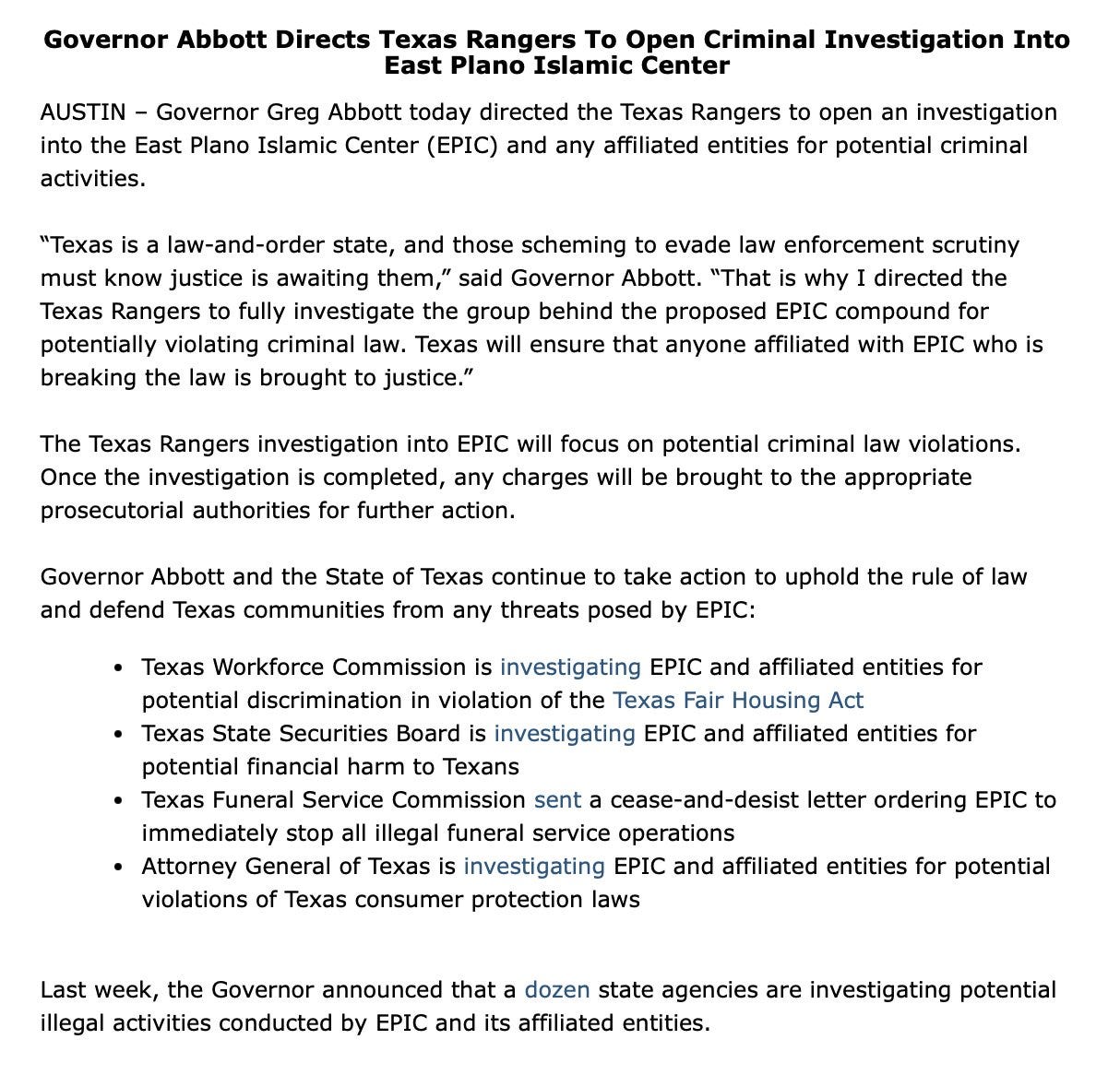 Governor Greg Abbott directed the Texas Rangers to open a criminal investigation (although he hasn’t said under what grounds) into the proposed EPIC City development. In a statement soaked in dog-whistle language, Abbott warned of “scheming” actors and promised that “justice is awaiting them.” He called the Muslim-led development a “compound,” invoking the language of extremism and militancy.