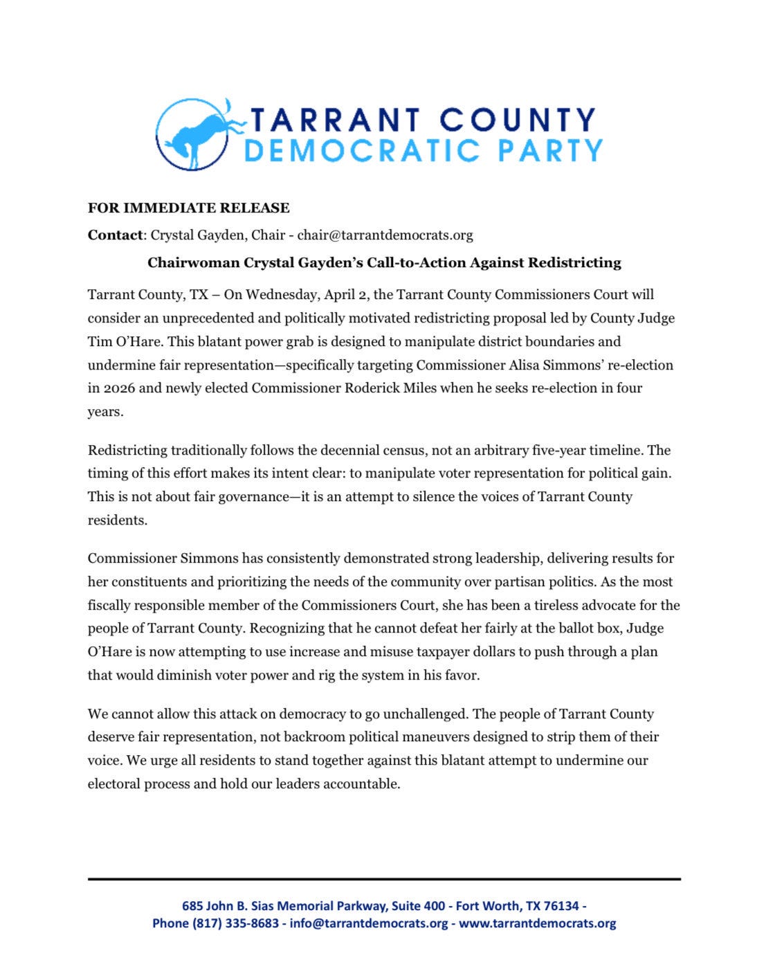 From the Tarrant County Democratic Party: