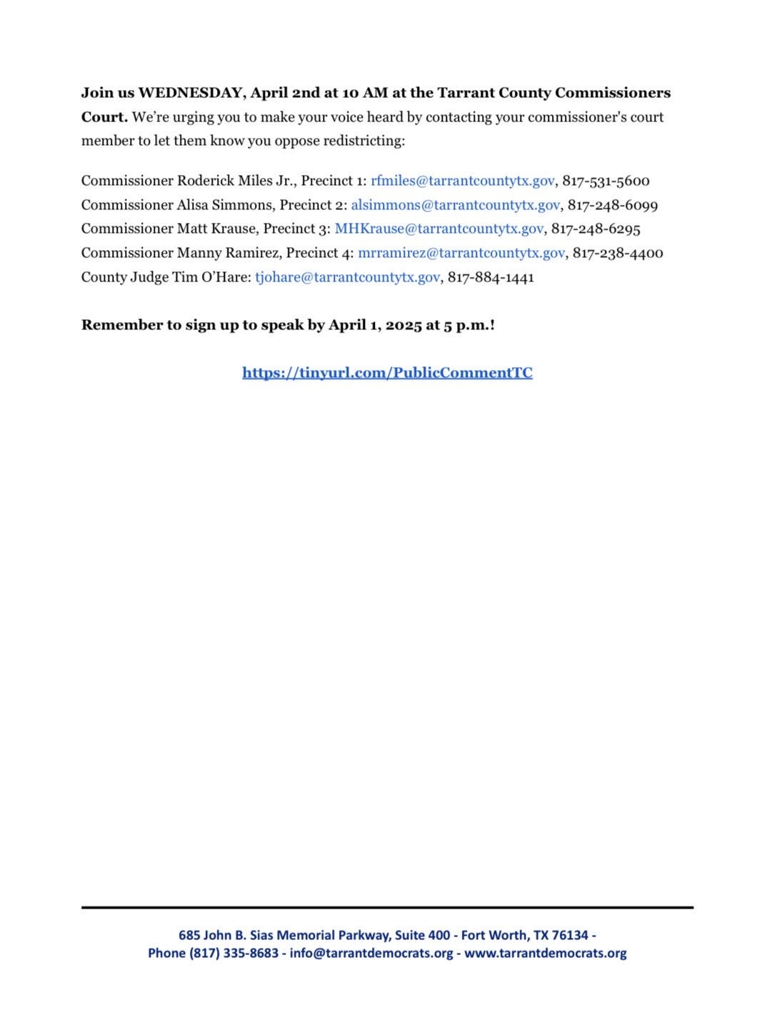 This is a call to action for Wednesday, April 2, 10 am at the Tarrant County Commissioners Court.